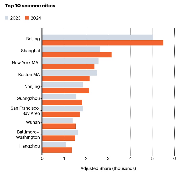 2024自然指数——科研城市综合排名 湖北日报讯(记者马文军)11月16日,施普林格·自然在线发布《自然》增刊《2024自然指数——科研城市》。最新榜单显示,在全球十大科学城市中,中国城市首次占据六席,实现多项领先。其中,武汉表现出色,全球排名升至第8位。该排名追踪了每个城市在高质量自然科学期刊上的科研产出。除北京、上海稳居前列外,南京、广州、武汉、杭州均跻身全球前十。该补充还评估受试者的表现。中国城市在化学、物理科学、地球与环境科学领域优势明显,甚至首次进入化学领域前十名。其中,武汉位居全球第4、5、6位分别在物理科学、化学、地球与环境科学领域表现出较强的综合科研实力。 “十四五”以来,物理科学排名武汉位居世界第四,化学排名武汉位居全球第五,环境科学排名武汉位居世界第六,“十四五”以来,武汉深厚的科教资源优势不断提升科技创新水平。数据显示,全市高新技术企业超过1.66万家,2024年技术合同成交额将突破2600亿元,科技企业贷款余额年均增速达到20%。创新科技正在成为武汉高质量发展的动力。